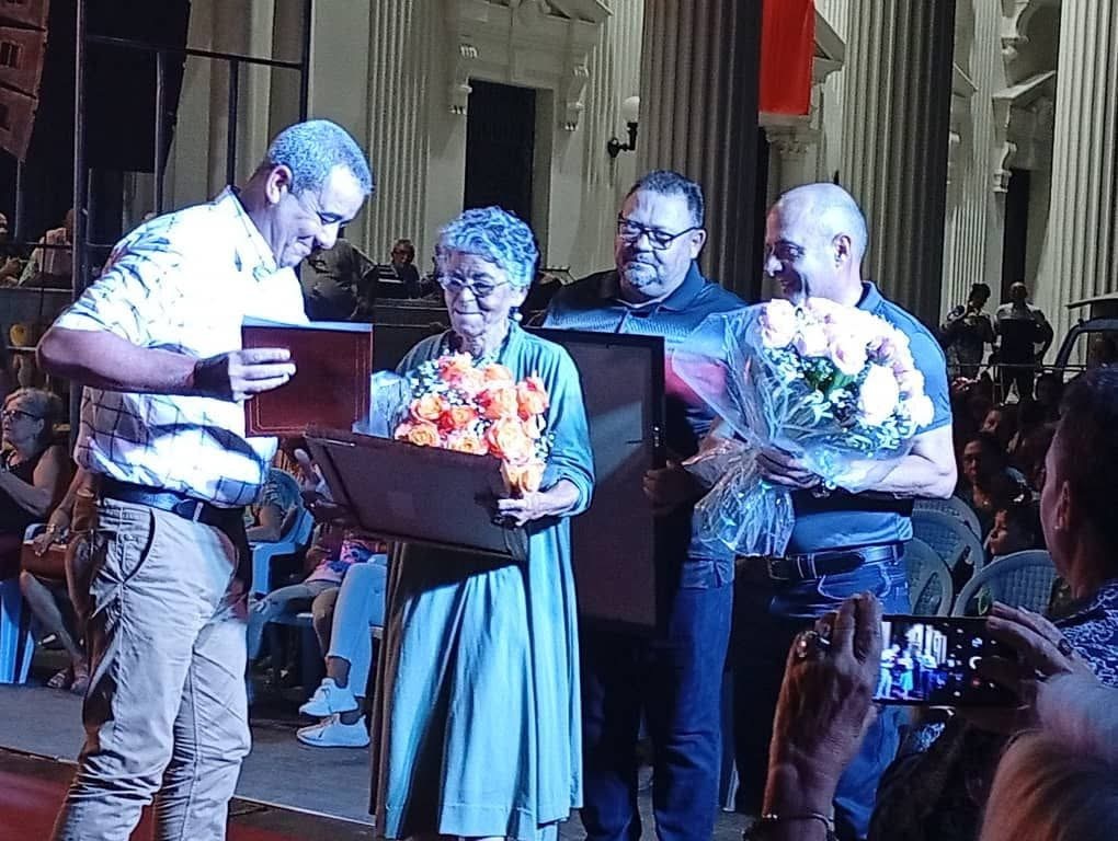 La creadora, a quien está dedicada la décimo sexta edición del certamen, recibió la alta distinción de manos del vicegobernador de la provincia Noel Chinea, del miembro del Buró del Partido Comunista de Cuba en el territorio, Isael Rodríguez, y del director provincial de Cultura Serguei Pérez.