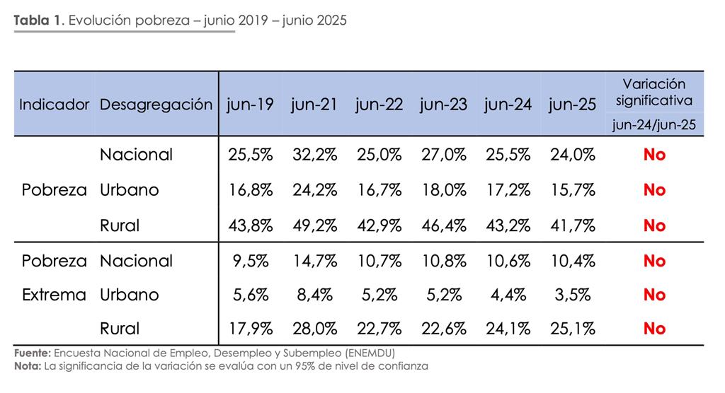 No obstante, los número del INEC indican que la pobreza extrema también muestra una variación mínima, ya que pasó de 10,6 por ciento en junio de 2024 a 10,4 por ciento en el mismo mes de 2025.