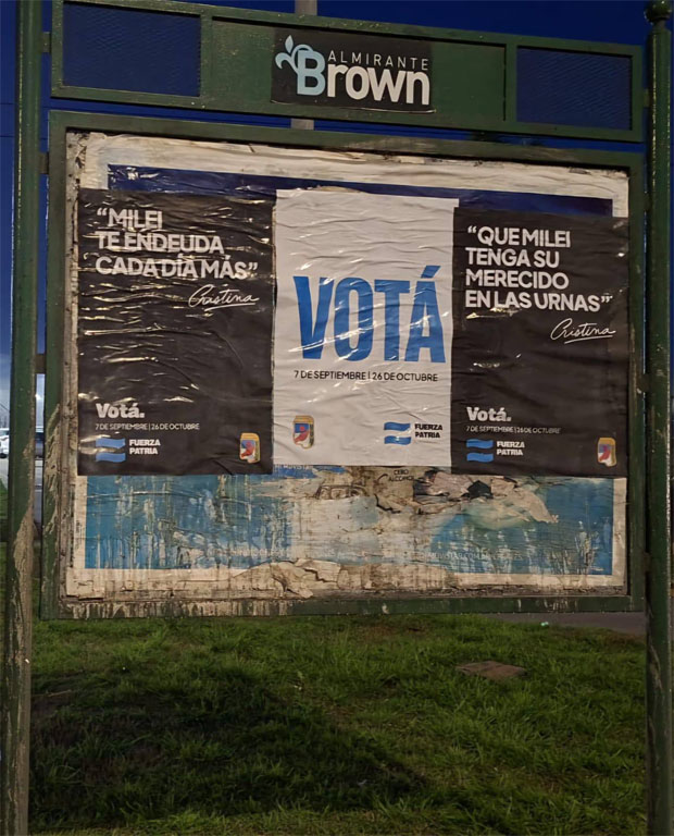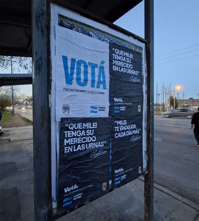 “Milei gobierna para los ricos”, “Milei te endeuda cada día más”, “Volvió el miedo a perder el trabajo” y “Que Milei tenga su merecido en las urnas” son algunas de las frases de Cristina que forman parte de la campaña de Fuerza Patria, coalición que agrupa a varios frentes del peronismo en PBA con el objetivo de frenar y derrocar la embestida de la alianza La Libertad Avanza-PRO.