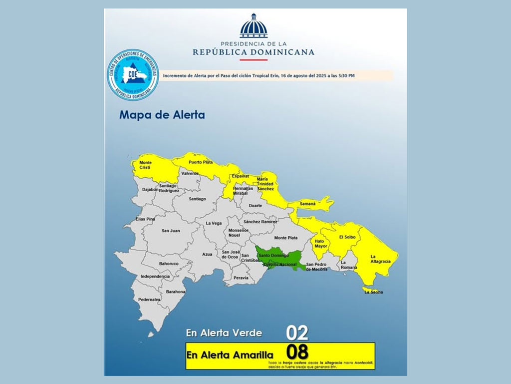 Por otra parte, Santo Domingo y el Distrito Nacional se mantienen hasta el momento en «alerta verde».