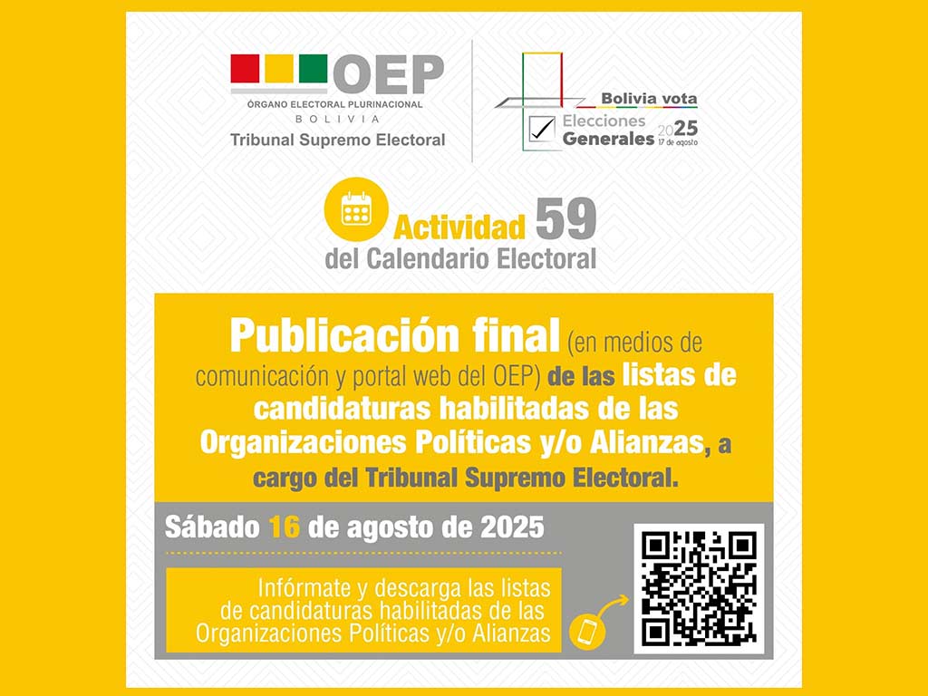 «En cumplimiento de la actividad 59 del Calendario Electoral, el TSE publica las listas de candidaturas habilitadas de las organizaciones políticas y/o alianzas», afirma el comunicado oficial difundido por el Órgano Electoral Plurinacional (OEP).