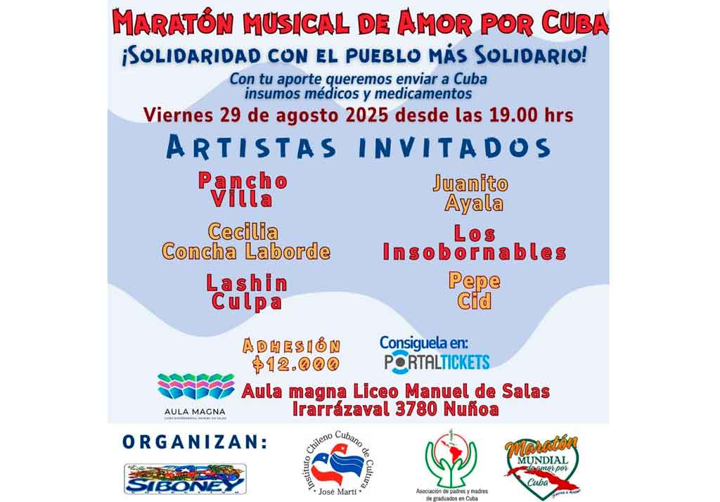 Son 20 años, dijo, de ese momento inolvidable y trascendental en sus vidas, y también para nosotros, los padres y madres de quienes se incorporaron al “ejército de batas blancas que recorre el continente salvando vidas”, como afirmó el líder de la Revolución, Fidel Castro. En el maratón musical participarán destacados artistas chilenos, entre ellos Francisco “Pancho” Villa, Cecilia Concha Laborde, Lashin Culpa, Juanito Ayala, Los Insobornables y Pepe Cid.