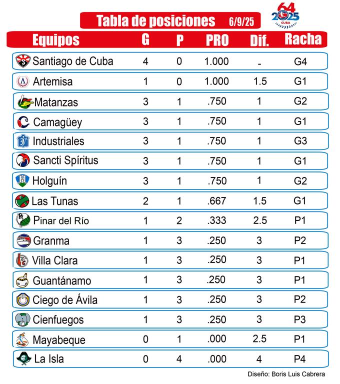 Otros que alcanzaron su tercera sonrisa fueron los Gallos de Sancti Spíritus, vencedores 6-2 sobre los Leopardos de Villa Clara con vuelacercas del veterano Frederich Cepeda, y los Cachorros de Holguín, que derrotaron 9-7 a los Alazanes de Granma.