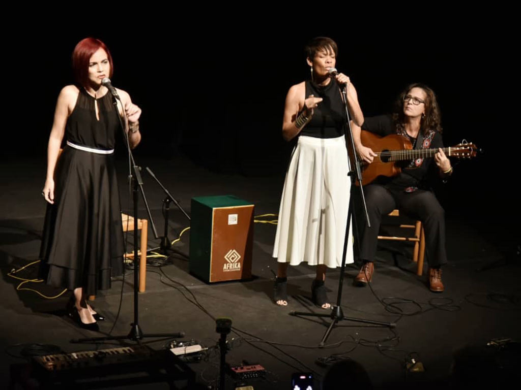 Un trío de cantoras paraguayas entonó una melodía en idioma guaraní, mientras, la instrumentista madrileña Virginia Rodrigo interpretó magistralmente dos canciones tocando el cajón.