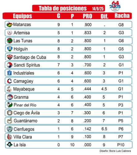 La tabla, tras dos subseries, se resume con Matanzas (9-1) al frente, seguidos por Artemisa (5-1), Las Tunas, Holguín y Santiago (8-2), Sancti Spíritus (7-3) e Industriales y Camagüey (6-4) cerrando la zona clasificatoria.