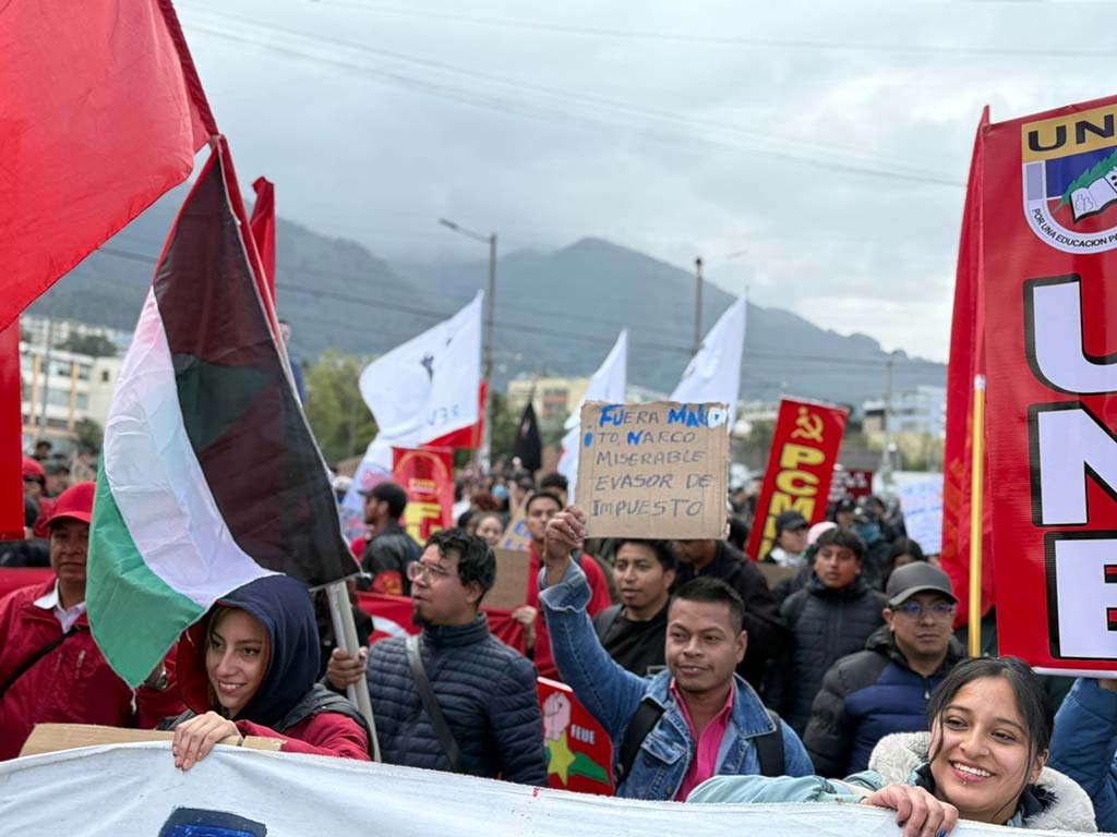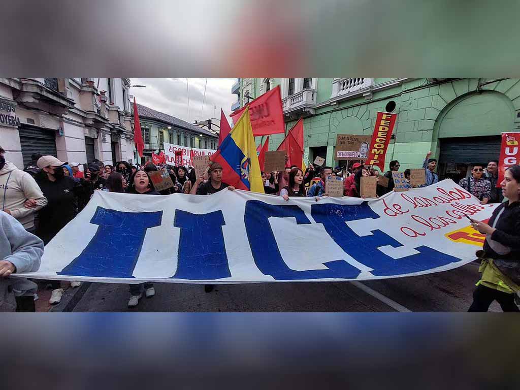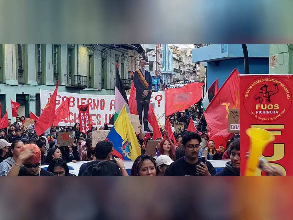 La protesta, convocada por la Federación de Estudiantes Universitarios del Ecuador (FEUE), comenzó en el campus universitario de la casa de altos estudios capitalina y avanzó hacia el Centro Histórico con consignas como “Fuera Noboa, fuera” y “Ecuador no es tu hacienda, no la vas a destruir”.
