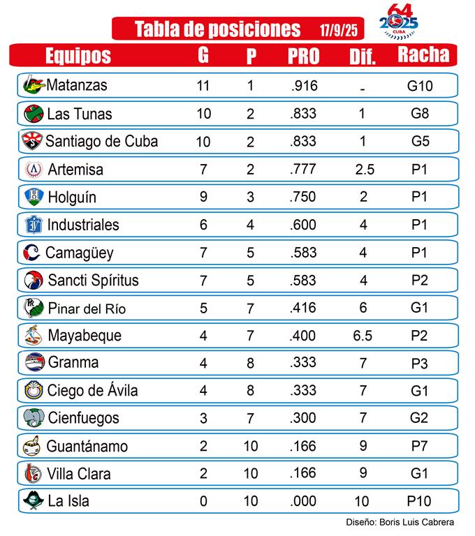 Las Tunas también alcanzó diez éxitos (ocho al hilo) al derrotar 10-8 a Granma, pese a jonrones de Guillermo Avilés y Alfredo Despaigne. En Guantánamo, Santiago de Cuba (10-2) superó 7-5 a los Indios, con vuelacercas de Yoel Yanki (dos) y Yoelkis Guibert.