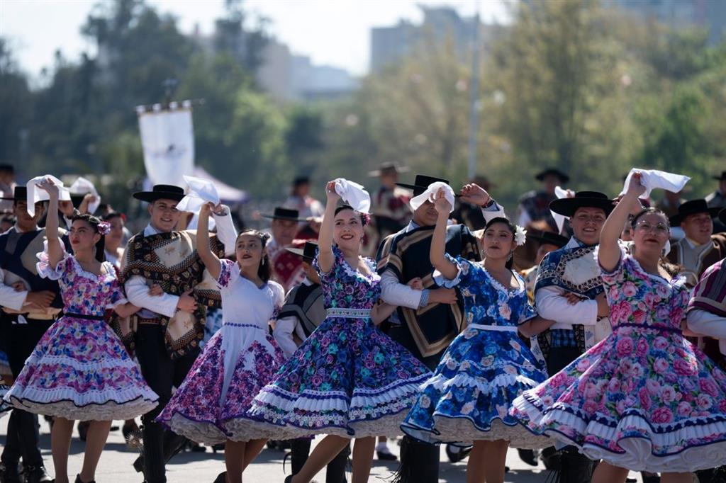 La actividad arrancó con el tradicional pie de cueca, la danza nacional interpretada por decenas de parejas, y a continuación 21 paracaidistas aterrizaron con gran precisión sobre la pista.
