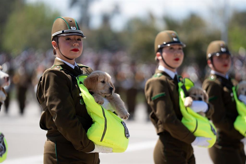 Durante cerca de tres horas, numerosas unidades de las distintas ramas militares y de la policía se desplazaron, entre ellas la brigada canina que, como de costumbre, incluyó a los cachorros portados en bolsas especiales.