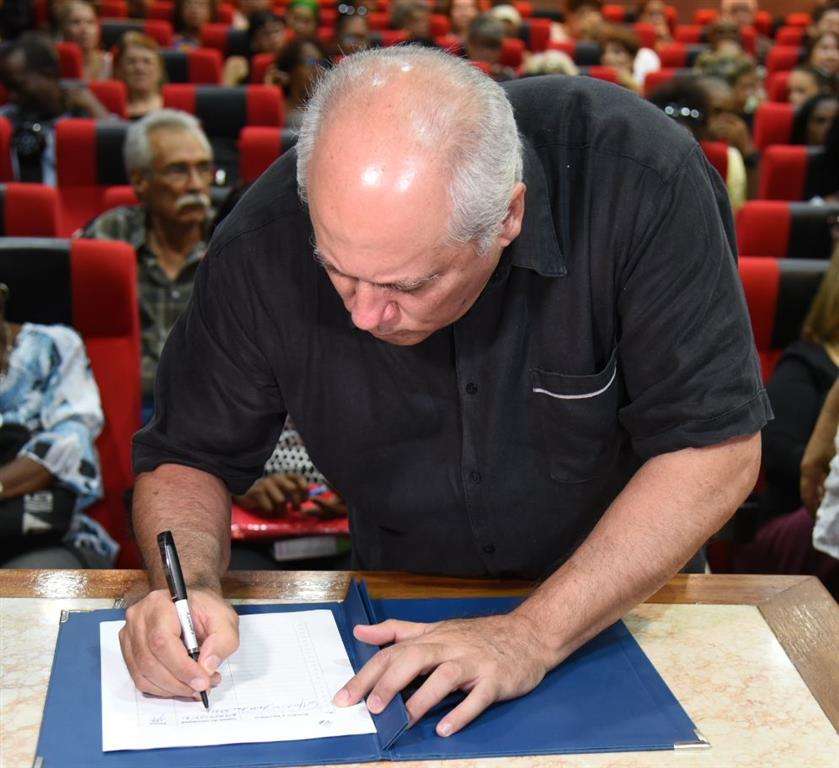 El embajador de Venezuela en Cuba, Orlando Maneiro, el ministro de cultura de Cuba, Alpidio Alonso, la cónsul de ese país en Cuba, Vivian Alvarado, y otros funcionarios del organismo central cubano firmaron el libro que contiene el acta de solidaridad con Venezuela.