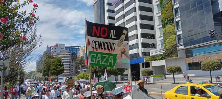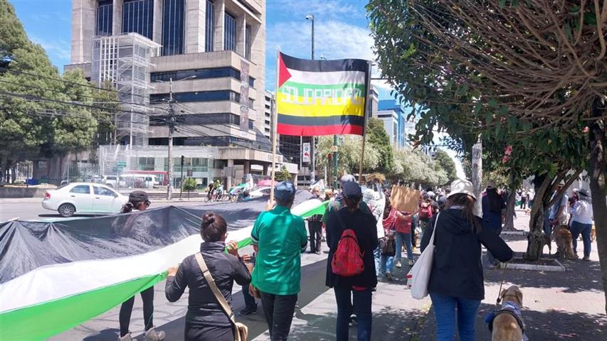 Con banderas y carteles los participantes marcharon en lo que constituye la segunda peregrinación en la capital ecuatoriana que, como explicó la activista María Alejandra Andrade, forma parte de un movimiento global de solidaridad con Palestina.