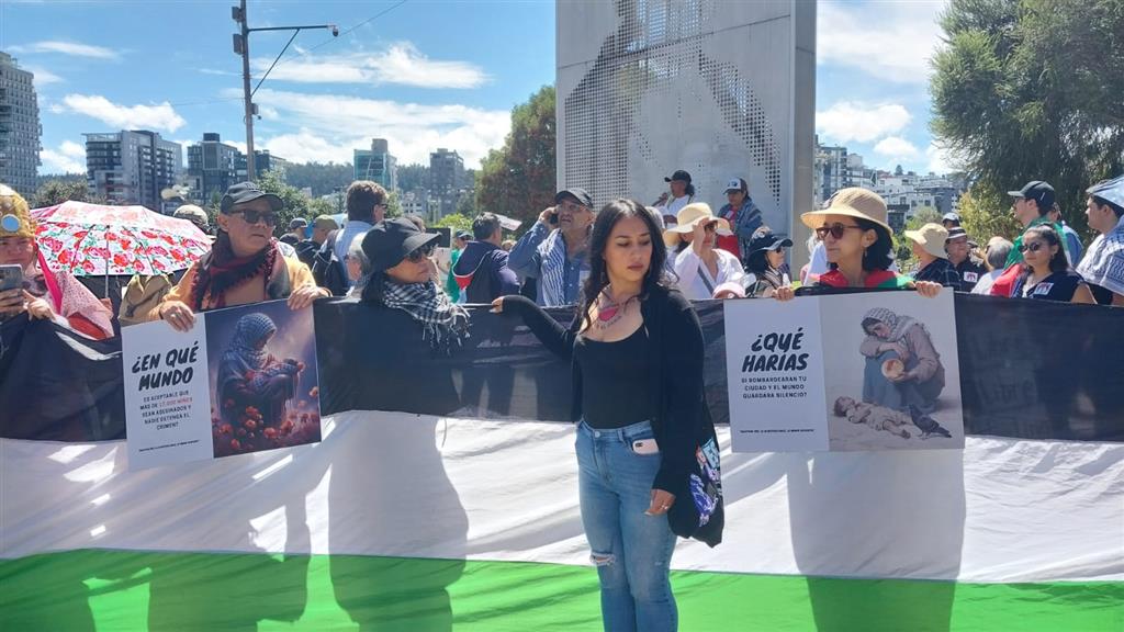 «Desde el páramo hasta el mar, Palestina vencerá» y «Los niños de Gaza no son una amenaza» fueron algunas de las consignas que corearon los manifestantes este domingo alrededor del parque La Carolina, en Quito, hasta llegar al monumento donde está ubicada la Campana de la Paz.