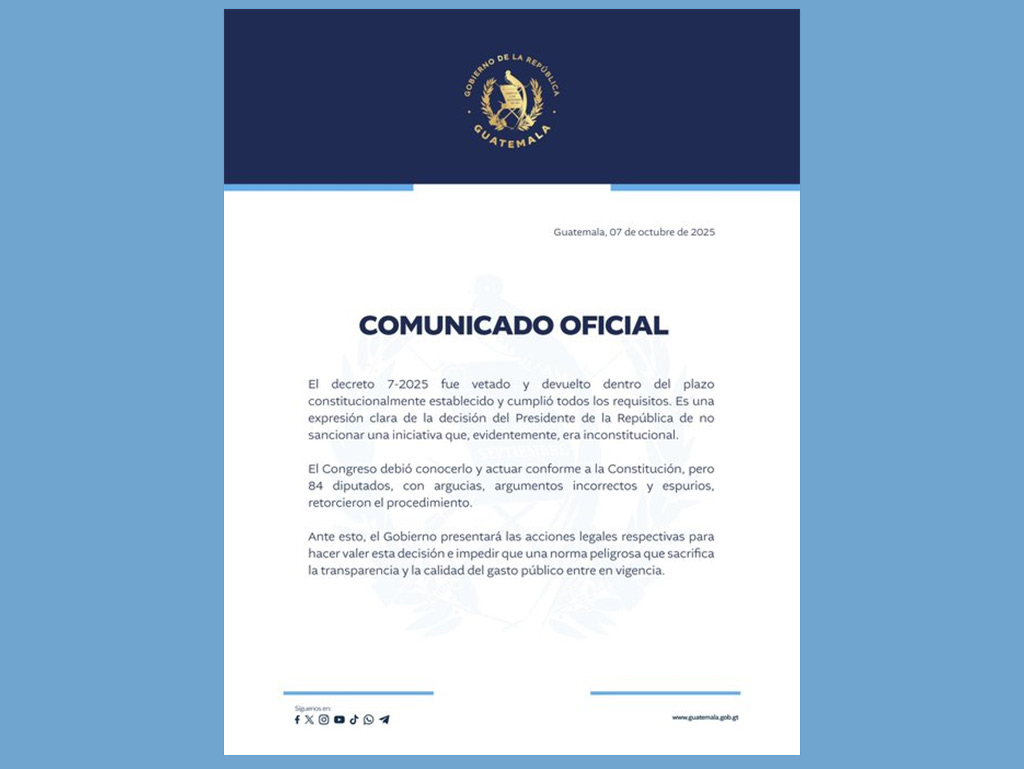 El decreto 7-2025 fue vetado y devuelto dentro del plazo constitucionalmente establecido y cumplió todos los requisitos, aseguró en el texto.