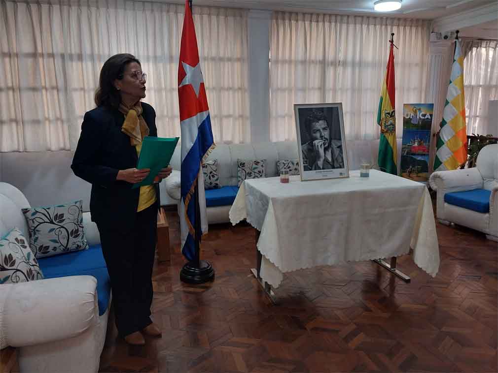 Ante el colectivo reunido en la sede de la misión diplomática, Pérez recordó la vigencia de las palabras pronunciadas el 18 de octubre de 1967 por el líder histórico de la Revolución cubana, Fidel Castro, en la despedida de duelo por la muerte del héroe universal.