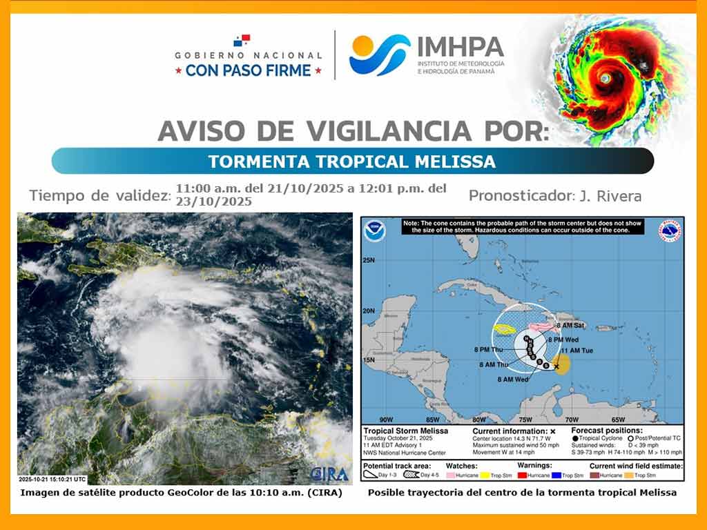 También adelantó que a pesar de que la trayectoria de Melissa no genere una incidencia directa en Panamá, provocará indirectamente lluvias significativas y un incremento en la velocidad de los vientos.