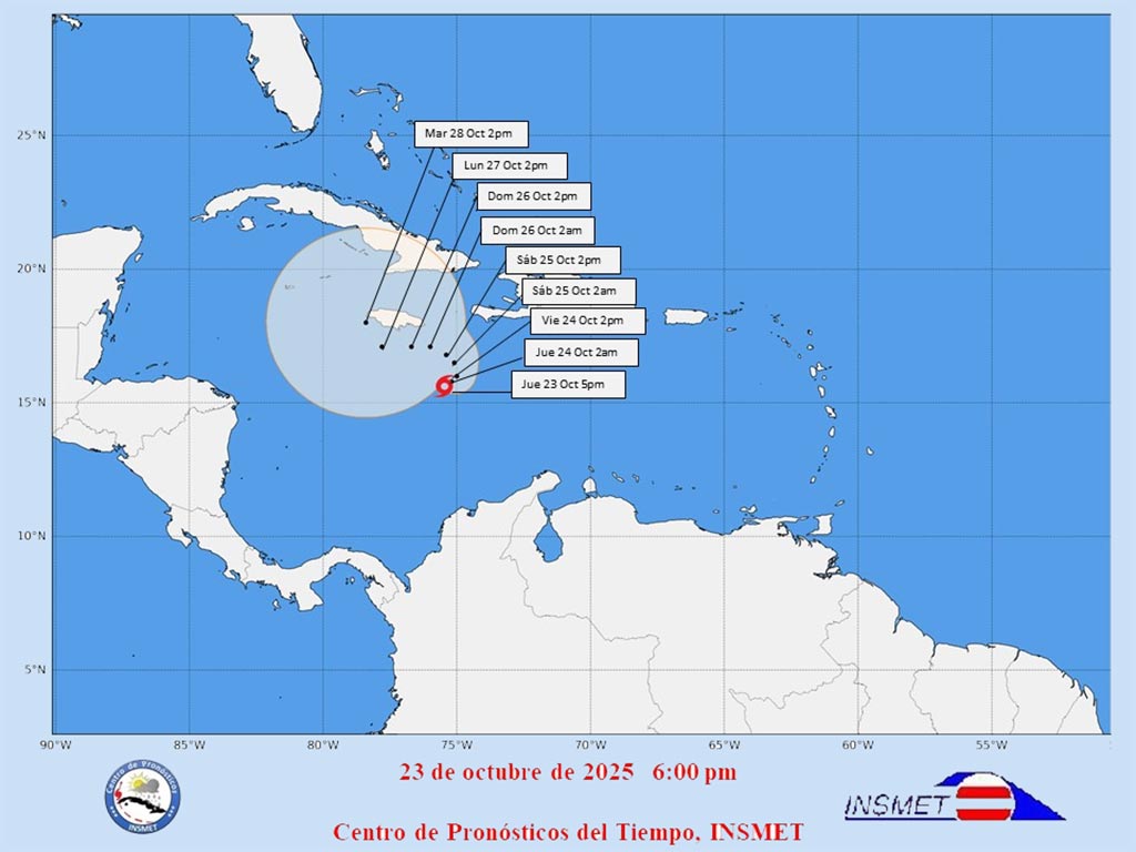 Dada la posición actual, su lento movimiento sobre aguas cálidas del mar Caribe y la época del año, el Insmet mantiene una estrecha vigilancia sobre la evolución y trayectoria de este sistema, que representa un peligro potencial para esta área geográfica.