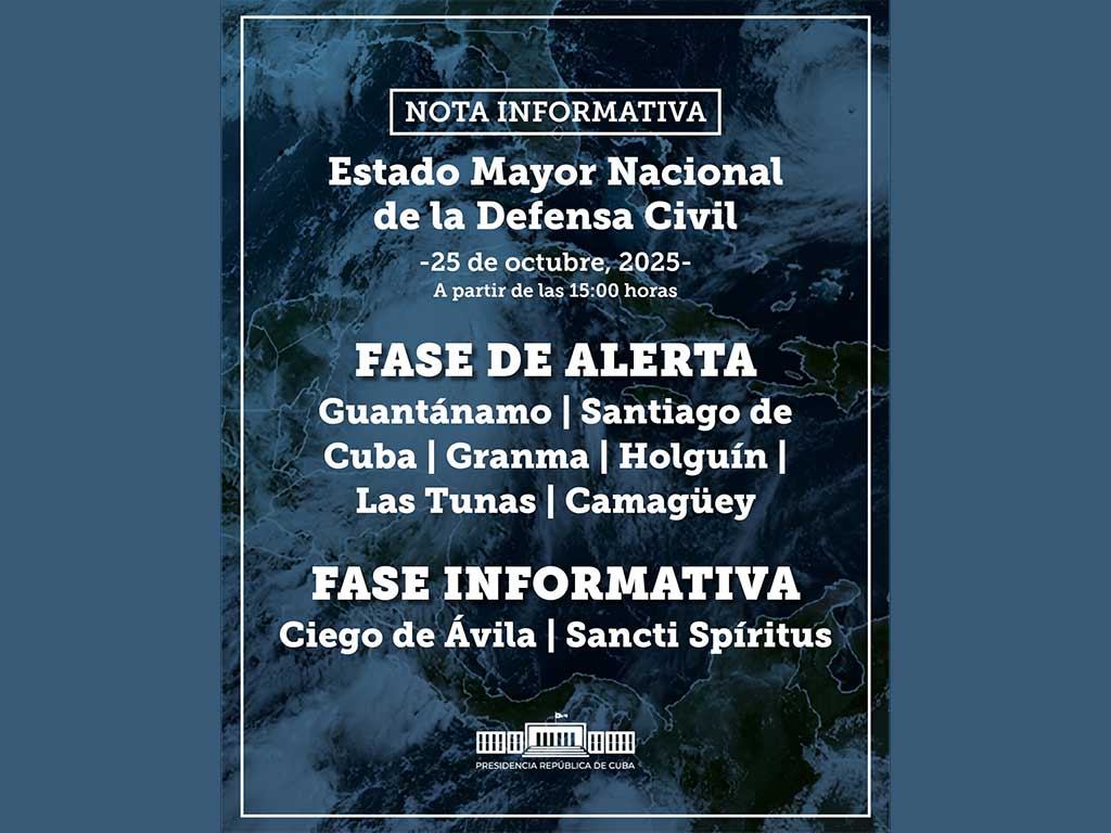 El país caribeño estableció desde las 15:00, hora local de este sábado la fase de Alerta Ciclónica para las provincias orientales de Guantánamo, Santiago de Cuba, Granma, Holguín, Las Tunas y Camagüey y la Fase Informativa para las provincias de Ciego de Ávila y Sancti Spíritus.