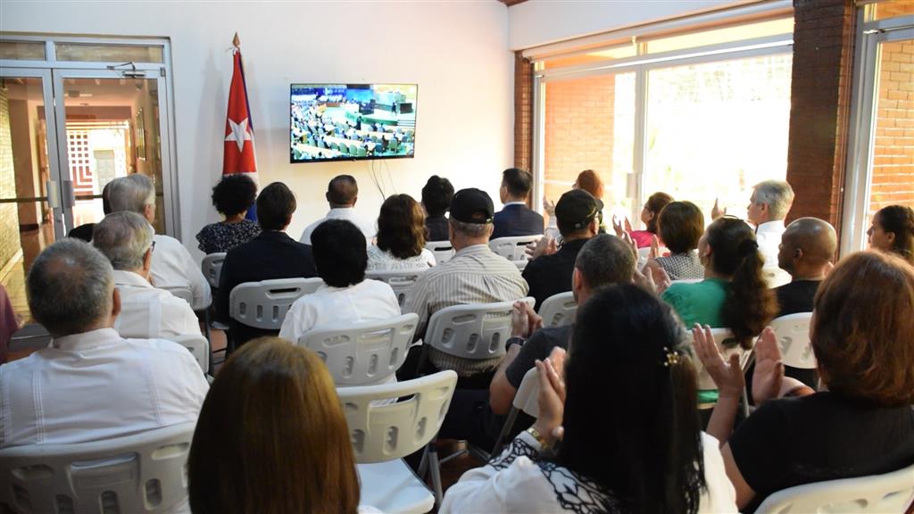 “Presenciamos un nuevo triunfo, una victoria contundente del pueblo cubano en su lucha contra el bloqueo”, expresó a Prensa Latina la embajadora de la nación caribeña aquí, Iliana Fonseca.