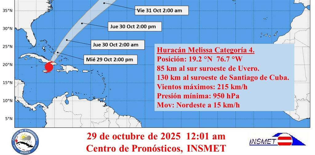 A la medianoche, el centro del huracán Melissa se localizó por los radares cubanos en los 19.2 grados de latitud Norte y los 76.7 grados de longitud Oeste, posición que lo sitúa a unos 85 kilómetros al sur de Uvero, municipio Guamá y a 130 kilómetros al suroeste de la ciudad de Santiago de Cuba.