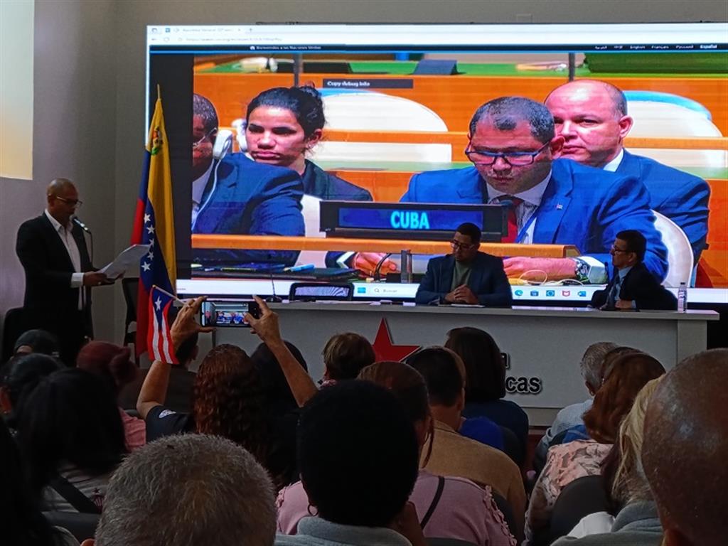 Diputados a la Asamblea Nacional, legisladores del Consejo Legislativo de Caracas, representantes de la Juventud del Partido Socialista Unido, del Movimiento de Amistad Mutua, cubanos residentes y del cuerpo diplomático y comuneros, celebraron el rotundo triunfo de la isla en la Asamblea General.