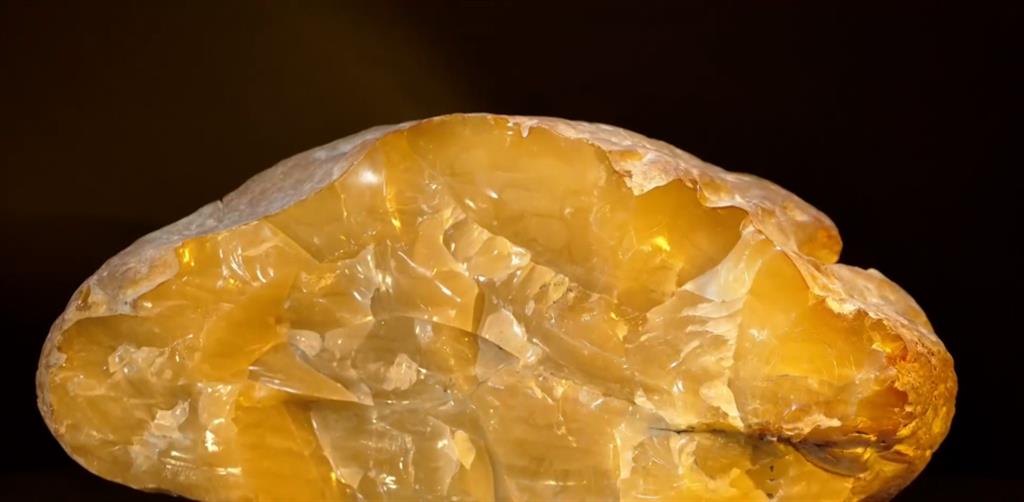 La piedra hallada tiene una distintiva forma semicircular con una gran astilla que revela la estructura interna del mineral y sus vetas dentro del ámbar amarillo brillante. La gema se extrajo de una capa de arcilla azul, donde se conservó de forma natural durante mucho tiempo.