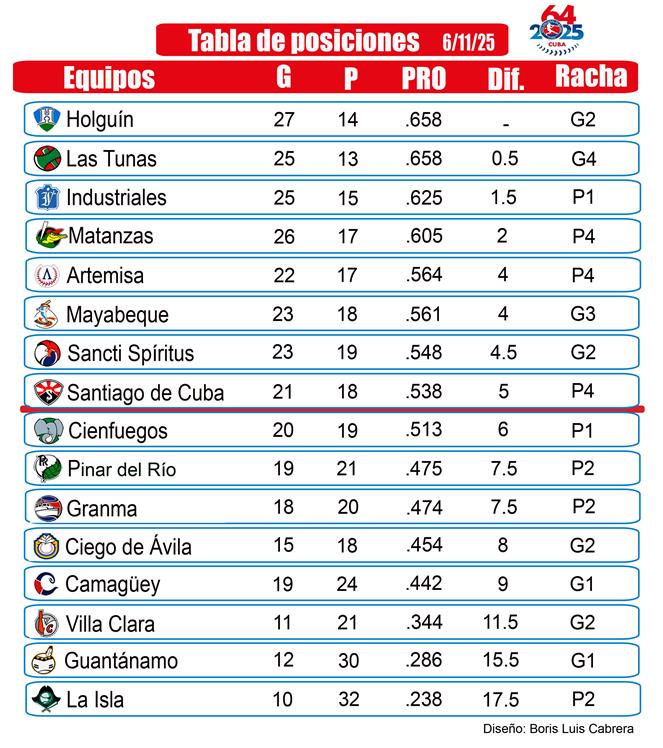 En paralelo, los Leñadores de Las Tunas se mantuvieron medio juego detrás tras apalear 12-2 a los Cocodrilos de Matanzas en su feudo del Julio Antonio Mella. Entre los 14 hits tuneros brillaron Yudier Rondón con jonrón, doble y cinco empujadas y Luis Antonio Pérez con un bambinazo.