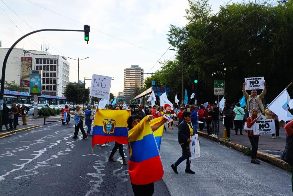 El presidente de la Conaie, Marlon Vargas, estuvo presente en la manifestación y llamó a decir cuatro veces no, contra el Gobierno y su consulta, que también indagará sobre la instalación de bases militares extranjeras, la reducción de legisladores y el fin del financiamiento público de partidos.