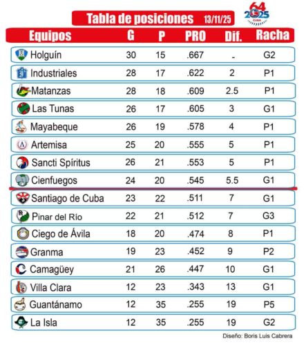 Despues de estos resultados Holguín sigue líder con 30-15 y ventaja de dos juegos sobre Industriales (28-17). Matanzas y Las Tunas marchan pegados detrás, mientras Mayabeque, Artemisa, Sancti Spíritus y Cienfuegos cierran la zona caliente.
