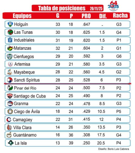 Hoy la tabla reafirma a Holguín (33-18) en la cúspide, seguido por Las Tunas (30-18), Industriales (31-19) y Matanzas (32-21), mientras Cienfuegos, Artemisa, Mayabeque y Sancti Spíritus se mantienen al acecho en zona caliente.