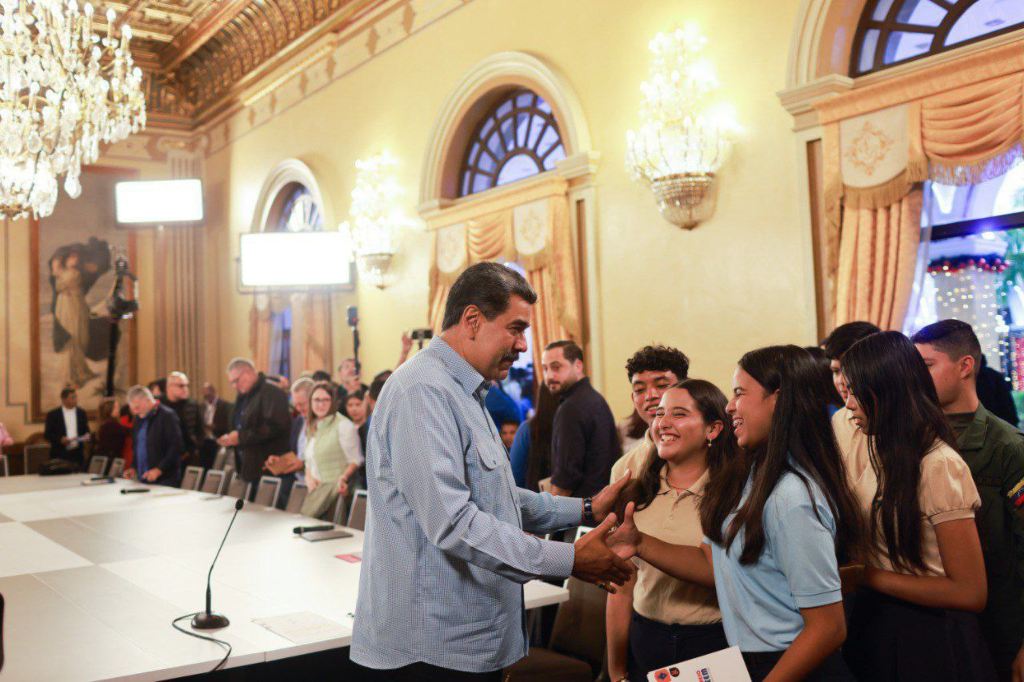 En el Palacio de Miraflores, sede del Gobierno, el jefe de Estado recibió a los jóvenes estudiantes encabezados por sus direcciones, quienes se incorporaron a su vez al Consejo de Ministros que sesionó este lunes en el Salón Néstor Kirchner, donde fueron analizados temas de la actualidad.