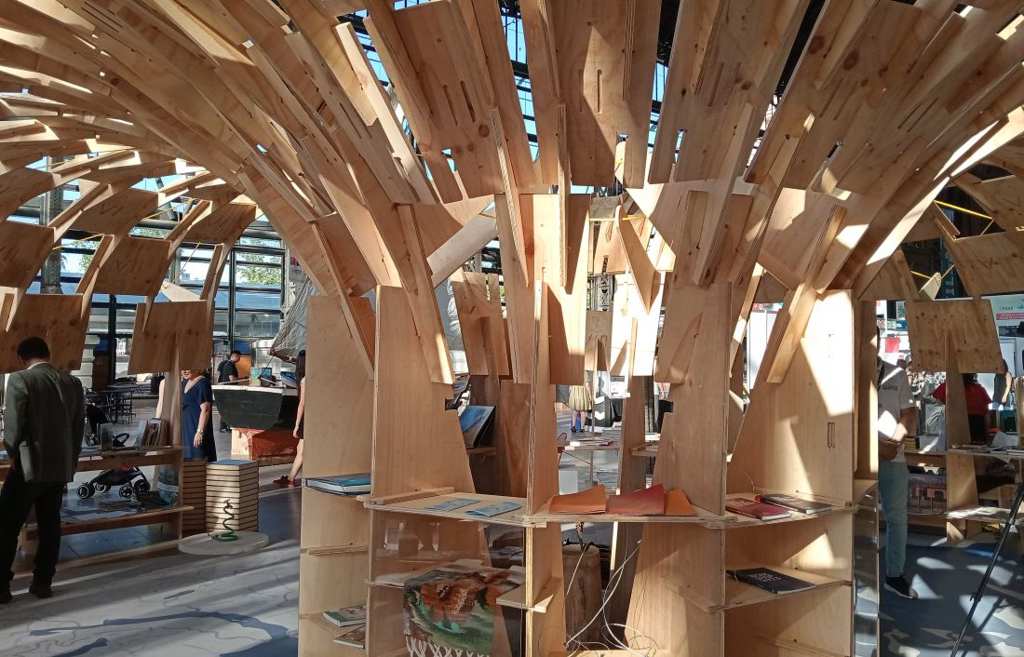 Llama la atención de los visitantes el pabellón de 100 metros cuadrados diseñado por estudiantes de Arquitectura de la Universidad San Sebastián, hecho totalmente con madera ensamblada sin la utilización de elementos de metal, como clavos o tornillos.
