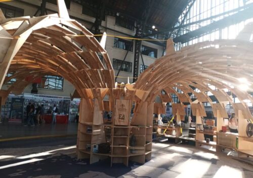 El estand, creado por los estudiantes de Chiloé Joaquín Gutiérrez y Belén Kimderg, está inspirado en la carpintería tradicional chilota. La estructura de 150 metros cuadrados está ensamblada sin clavos, ni tornillos, mediante precisión digital y criterios de sostenibilidad.