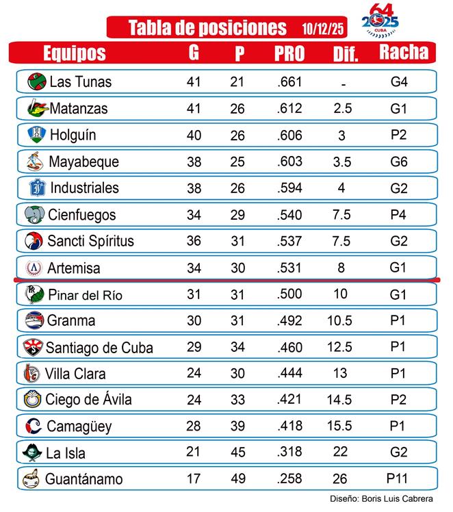 La tabla de posiciones muestra a Las Tunas firmes en la cima (41-21), seguidos por Matanzas (41-26), Holguín (40-26), Mayabeque (38-25) e Industriales (38-26), con Cienfuegos, Sancti Spíritus y Artemisa completando la zona de clasificación.