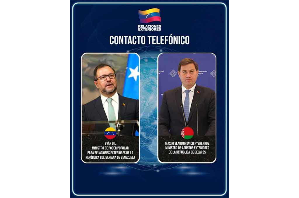 Gil sostuvo también en la jornada “una fructífera conversación telefónica” con el ministro de Asuntos Exteriores de Belarús, Maksim Ryzhenkov, en la que reafirmaron la agenda bilateral y las sólidas relaciones de amistad y cooperación entre los gobiernos de Nicolás Maduro y Alexander Lukashenko.
