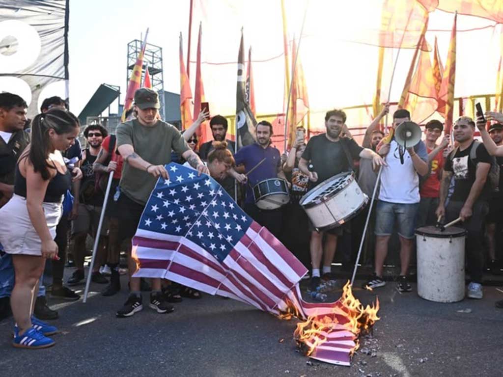 Frente a la sede diplomática se vieron imágenes que parecían relegadas al pasado: la quema de banderas norteamericanas, mientras se escuchaban alto consignas contra la intervención de Washington en la región y contra Venezuela al fuerte compás de tambores.