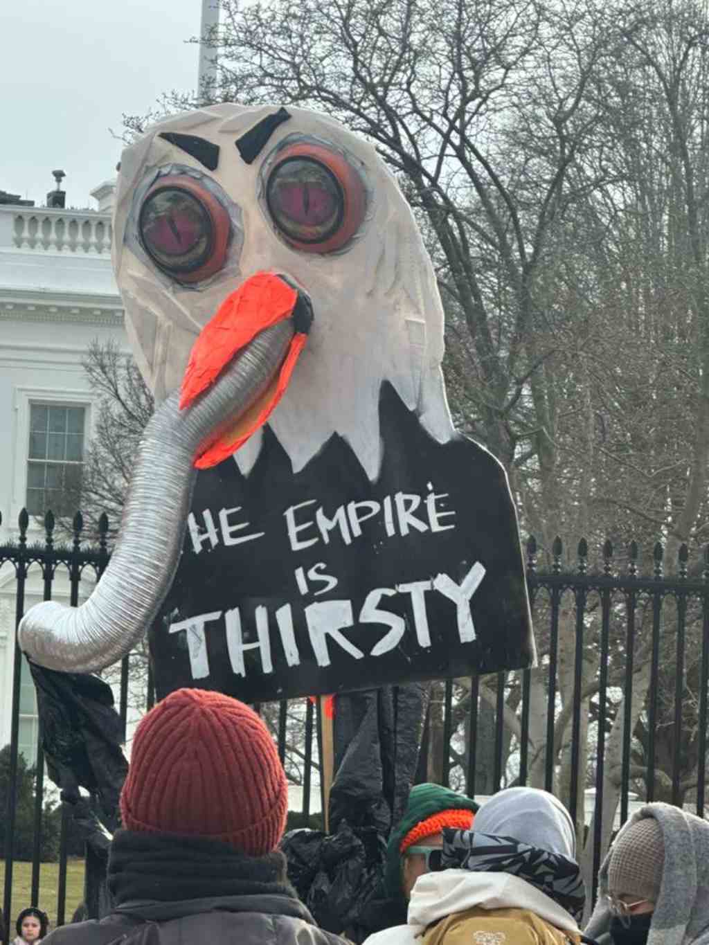 En la capital del país, los participantes se congregaron frente a la Casa Blanca, donde corearon consignas de “¡No a la guerra contra Venezuela!” y enarbolaron carteles en los que se podía leer que Estados Unidos frenara una nueva guerra. «No a la guerra por petróleo», indicaban otros.