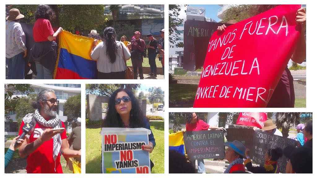 Ortiz, Meneses y otros presentes en el plantón en Quito, cerca de la residencia del embajador de Estados Unidos en esta capital, repudiaron la postura del Ejecutivo, que respalda una acción violatoria del derecho internacional.