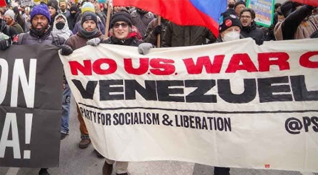 La víspera, se reportó una ola de expresiones de respaldo a la nación sudamericana y contra la guerra en varias ciudades de Estados Unidos. Convocados por la coalición ANSWER, las protestas tuvieron lugar en Washington DC, la capital del país.