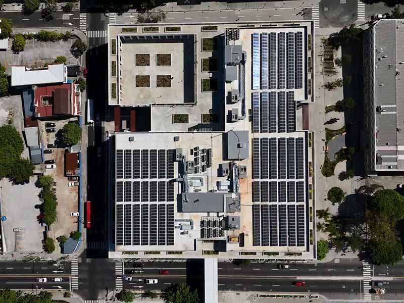 Destacan en la estructura una pasarela sobre la Avenida 25 que conecta ambas instalaciones y la utilización de la energía solar con paneles en el techado de la edificación.