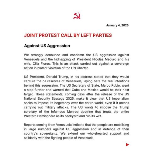 Nueva Delhi, 5 ene (Prensa Latina) Los partidos de izquierda de India convocaron a protestas nacionales en solidaridad con Venezuela y con los pueblos de América Latina como Cuba y México amenazados hoy por el gobierno del presidente Donald Trump.