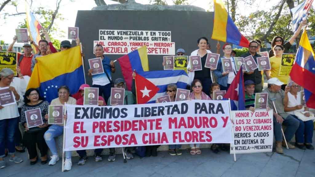 Este viernes en el monumento a la Constitución, en esta capital, grupos del FMLN repudiaron la agresión de Washington contra el pueblo venezolano y demandaron la devolución de Maduro y su esposa Cilia Flores.