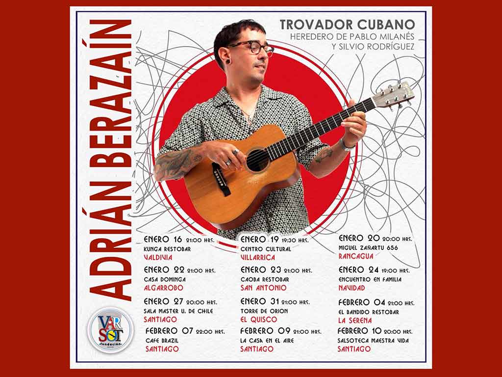 Santiago de Chile, 23 ene (Prensa Latina) Con letras de alto nivel poético que invitan a la reflexión, el cantautor cubano Adrián Berazaín realiza hoy una serie de presentaciones en Chile, en un recorrido descrito por él mismo como una gira de amor.