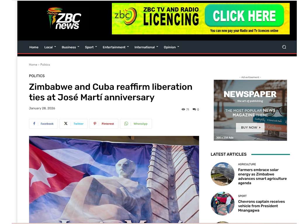 Zimbabwe y Cuba reafirman solidaridad en la conmemoración de José Martí, tituló The Herald al reflejar palabras de la embajadora, excelentísima señora Susellys Pérez Mesa, quien afirmó que no solo se honra a Martí como figura clave de la independencia, sino también nos inspiramos en sus ideales para afrontar los desafíos internacionales contemporáneos.