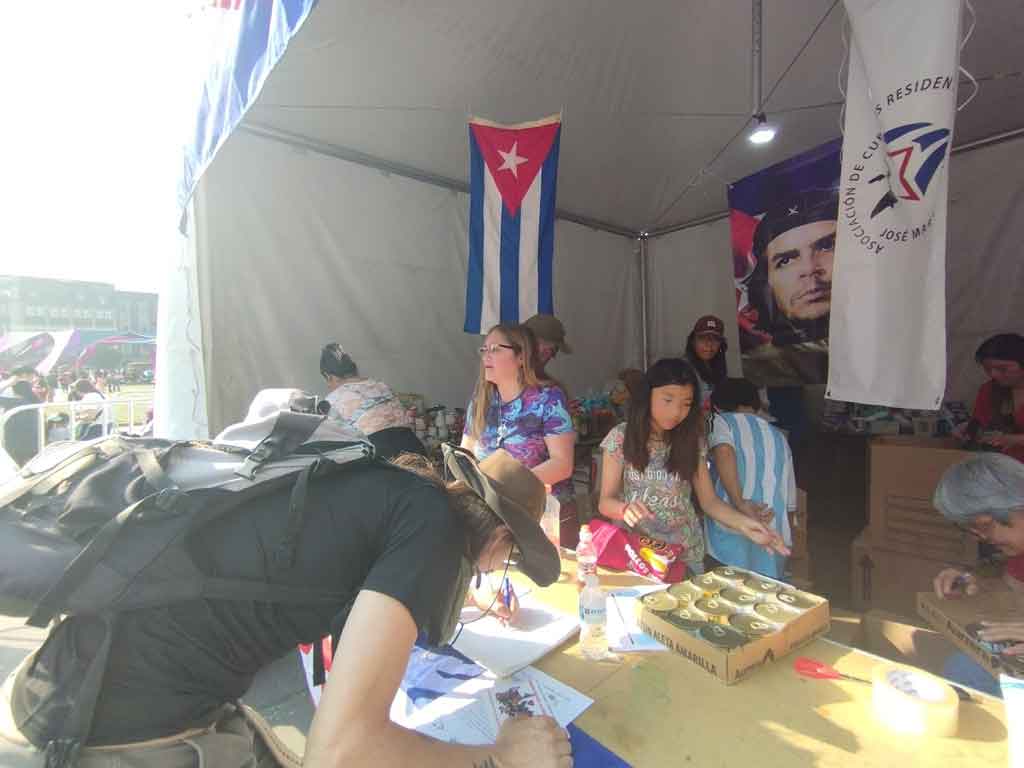 Entre banderas de ambas naciones e imágenes del líder histórico de la Revolución en la isla, Fidel Castro, y del guerrillero argentino-cubano Ernesto (Che) Guevara, el espacio dispuesto para recibir víveres con destino a la mayor de las Antillas vivió un ajetreo constante.