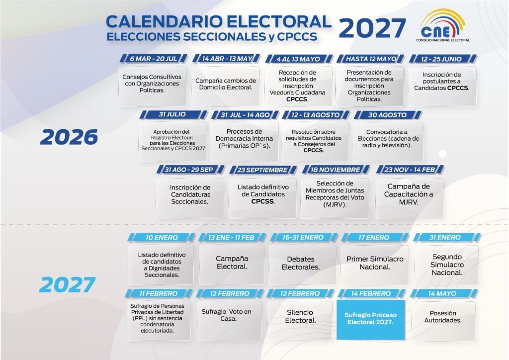 De acuerdo con el cronograma, los funcionarios que resulten electos tomarán posesión el 14 de mayo de 2027, según lo establece la Constitución y la ley.