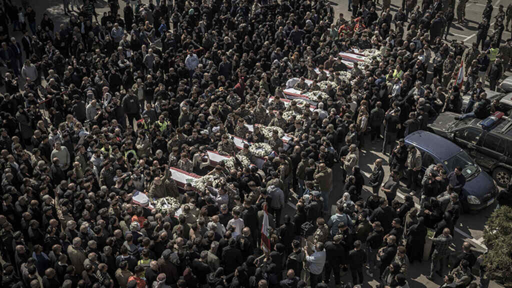 El funeral se celebró en la ciudad de Sidón, donde los féretros, cubiertos con banderas nacionales, fueron expuestos en el edificio gubernamental ante una multitud de funcionarios, familiares y pobladores.