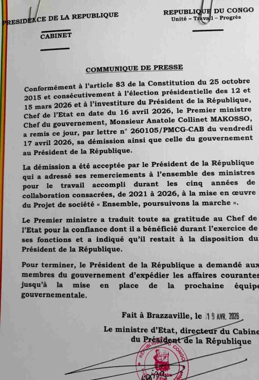 El primer ministro entregó su renuncia por carta el viernes último, así como la de su gabinete, la cual fue aceptada por el mandatario congoleño, quien agradeció a todos por el trabajo realizado durante los cinco años de colaboración de 2021 al 2026.