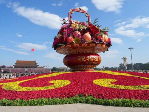 Beijing, 25 sep (Prensa Latina) China finalizó hoy la instalación de adornos florales en las arterias principales de esta capital por el Día Nacional, entre ellos, el tradicional búcaro gigante en la Plaza de Tiananmen.