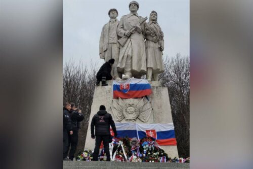Cubren con banderas el monumento soviético vandalizado en Eslovaquia