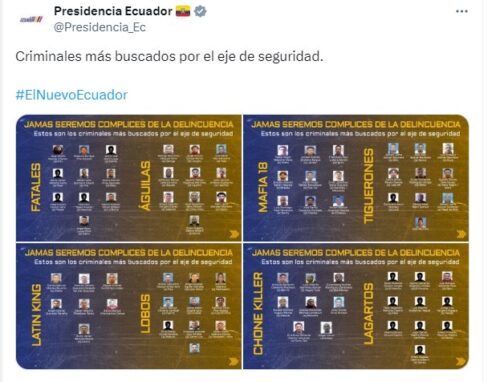 Quito, 19 abr (Prensa Latina) El gobierno de Ecuador reveló un listado de “capos reales” que operan hoy en el país y constituyen “objetivos militares” como parte de la lucha contra el crimen organizado.